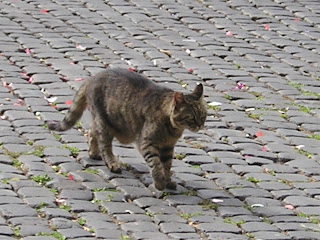 Ce n'est pas le même que celui du Quirinal. Lui, je l'ai rencontré devant la basilique San Giovanni e Paolo où il battait le pavé. Comme son pelage était lustré et qu'il avait l'air en parfaite santé, j'ai estimé qu'il n'était pas sur le pavé. Il se promenait simplement sur le pavé du roi, sans se prendre pour le maître du pavé. Je lui ai adressé un compliment qu'il n'a pas eu l'air de considérer comme le pavé de l'ours. Nous n'avons pas eu besoin de nous disputer le pavé, car j'ai pris garde de lui abandonner le pavé. Pour rien au monde je n'aurais voulu lui faire quitter le pavé. Le quartier était calme, personne ne brûlait le pavé. Il put donc sans problème tenir le haut du pavé. Certains pensent peut-être qu'il n'était qu'un batteur de pavé. Que nenni ! Cet habitué des lieux était le sage gardien de leur mystère.