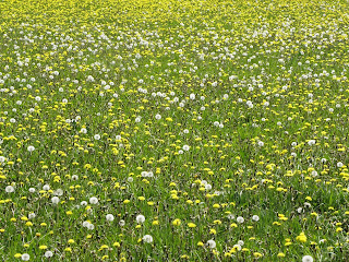 Des champs entiers!! une plante qui se reproduit facilement et mangée en salade ici avec des petits lardons!! on peut même manger les fleurs et depuis des lustres les anciens connaissaient ses propriétés en bétacarotènes, en minéraux, particulièrement en potassium, d'où ses propriétés diurétiques.( d'où son nom pisse au lit!)enfin je veux dire pissenlit