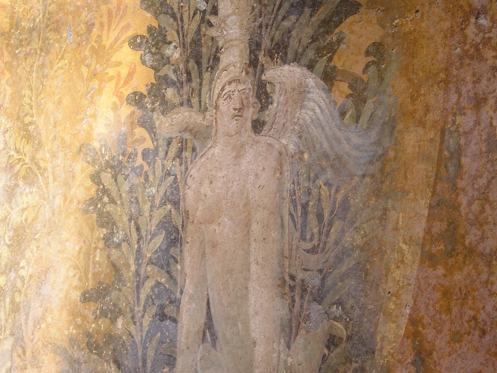 Pour terminer cette visite d'Oplontis, je vous propose les fresques du viridarium. La villa de Poppée comprenait de nombreux et beaux jardins extérieurs et aussi intérieurs, figurés dans les salons construits autour, avec des fontaines, des éléments végétaux symboliques et même une créature ailée au visage troublé.