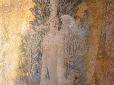 Étrangement ces lieux avec ces fresques aux dessins pourtant gracieux me laissent une vague inquiétude comme s'ils étaient hantés. Et votre commentaire : "une créature ailée au visage troublé" va dans ce sens.