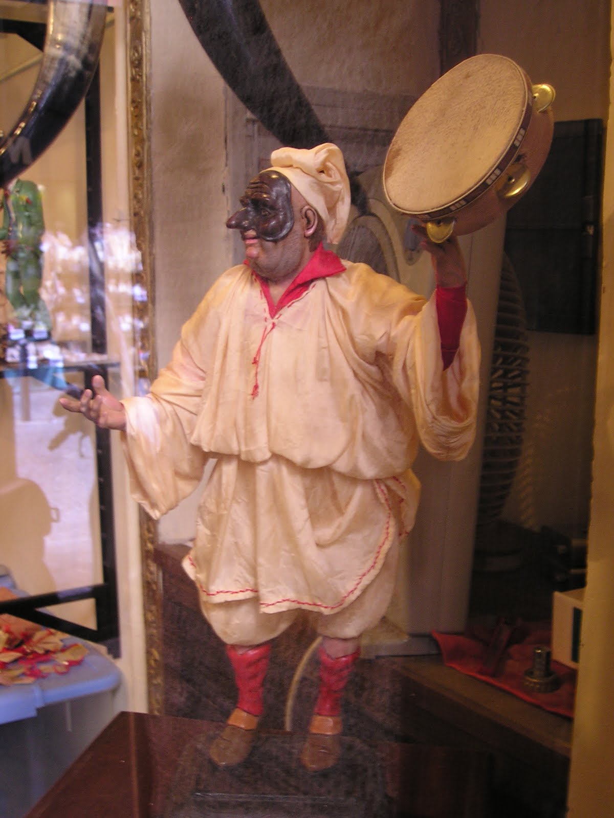 "Il multiplie les pitreries, il exécute des tours d'acrobatie. Il est vêtu d'une large tunique flottante aux diverses nuances de blanc. [...] Vous avez bien sûr reconnu Polichinelle, célèbre personnage de la Commedia dell'arte originaire de la Campanie, le masque napolitain par excellence"...