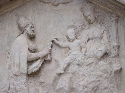 Bonjour, Evelyne. Le bas-relief représente Saint Pierre agenouillé devant la Vierge et l'Enfant. C'est un beau symbole, car ce bas-relief se trouve tout près de San Pietro di Castello.