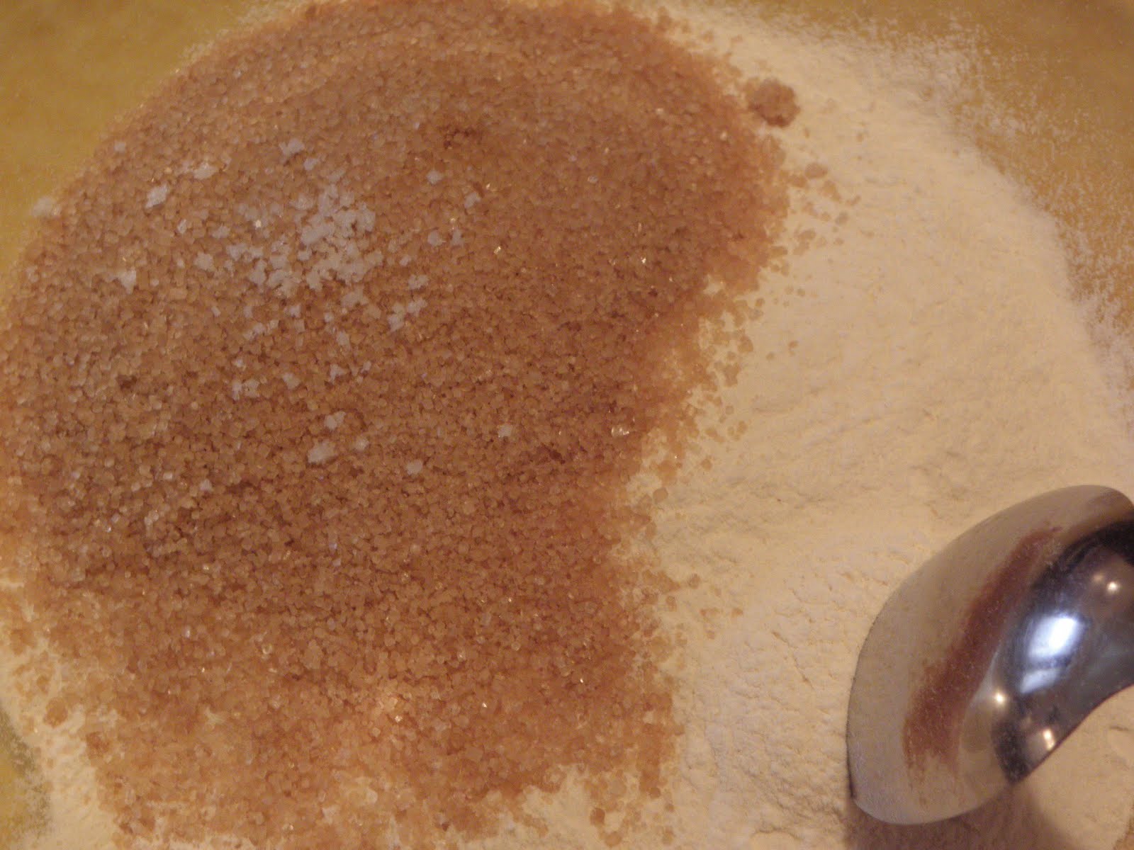 .Pendant que les fruits cuisent doucement, dans un saladier, mélanger 150g de farine, 75g de sucre en poudre et une pincée de sel. Ma préférence, vous l'avez deviné, va au sucre roux et à la fleur de sel (de l'île de Ré si possible).
