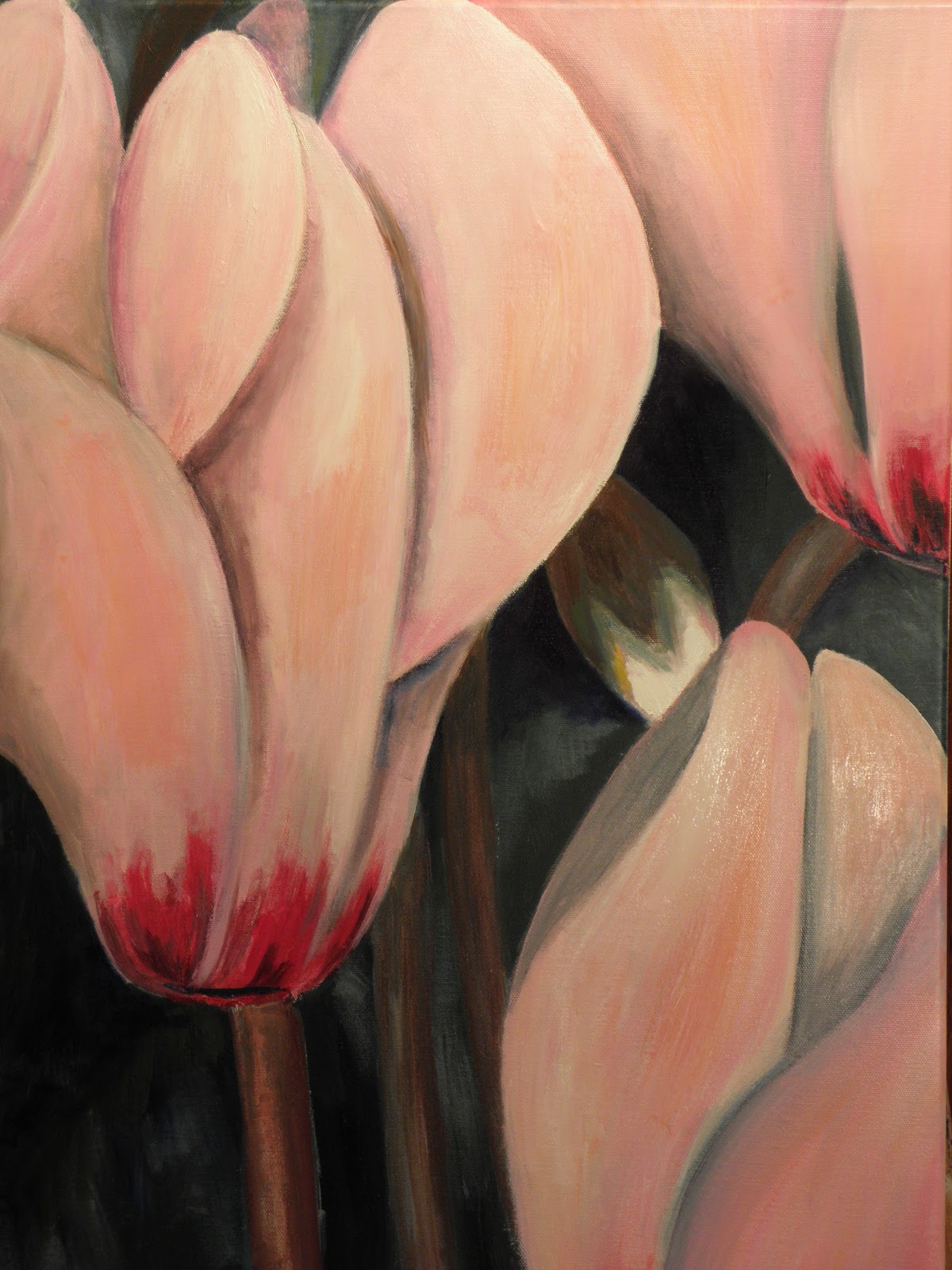 A différentes périodes de l'année, Paul nous apportait des fleurs. La saison venue, nous disposions d'un pot de cyclamen pour trois ou quatre élèves. Leur vigueur, leur droiture élancée vers la lumière, la fragile et forte ordonnance de leurs pétales à l'admirable torsion géométrique, compensaient leur apparente modestie. Un beau symbole d'élégance, de sensibilité et de réflexion, à l'image de Paul. C'est pourquoi, afin de lui rendre un hommage sincère, j'ai choisi de peindre un cyclamen que je vous présente aujourd'hui.