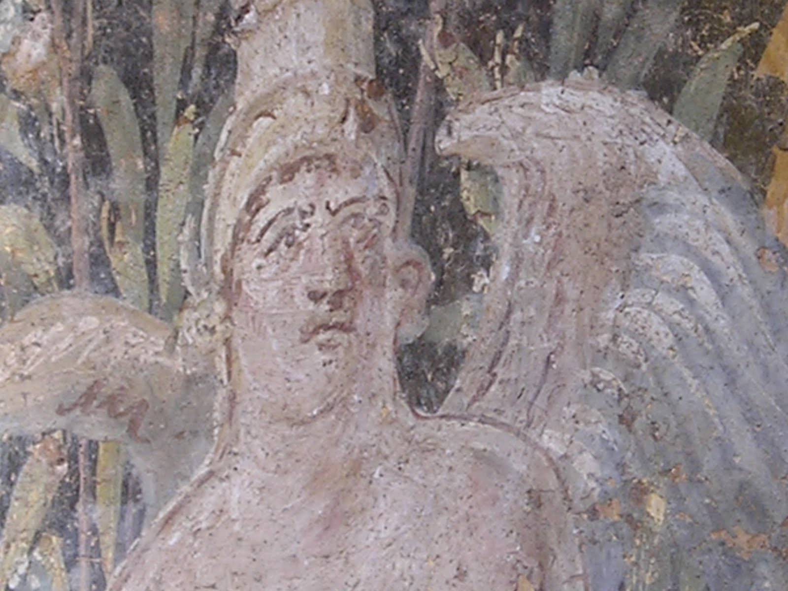 Étrangement ces lieux avec ces fresques aux dessins pourtant gracieux me laissent une vague inquiétude comme s'ils étaient hantés. Et votre commentaire : "une créature ailée au visage troublé" va dans ce sens.