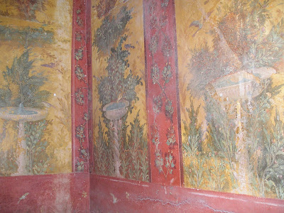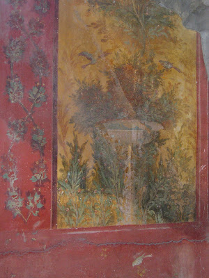 Pour terminer cette visite d'Oplontis, je vous propose les fresques du viridarium. La villa de Poppée comprenait de nombreux et beaux jardins extérieurs et aussi intérieurs, figurés dans les salons construits autour, avec des fontaines, des éléments végétaux symboliques et même une créature ailée au visage troublé.