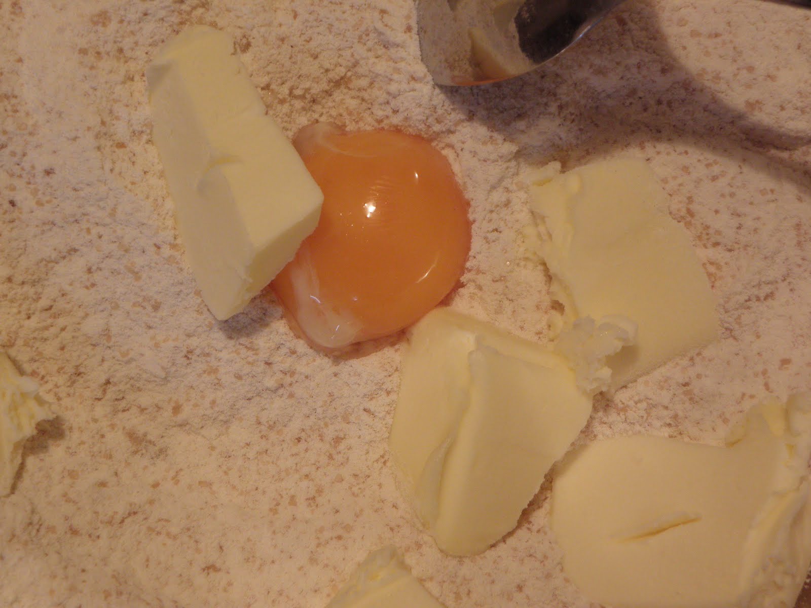 Ensuite, ajouter un jaune d'oeuf et 110 g à 120g de beurre coupé en morceaux (la quantité de beurre varie selon sa température : à température ambiante, 110g suffiront ; juste sorti du réfrigérateur, 120g seront nécessaires). Commencer à mélanger à la cuiller et finir aux doigts afin d'obtenir une pâte émiettée, le crumble.